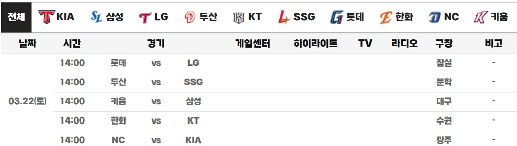 각 구장에서 2연전이 진행된 후, 정규 시즌 144경기가 본격적으로 시작됩니다.